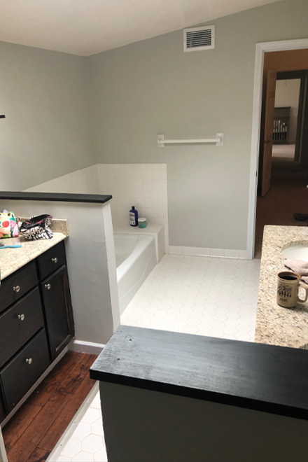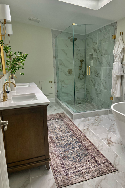 Elite ATL Construction presents our newly constructed marbled-tile bathroom. This luxurious bathroom was crafted to home a stunning Jack and Jill counter, regal bathtub, and elegant double-head shower. A custom dogbath was also installed in the home's mudroom to ensure that every member of the family bathed in luxury.